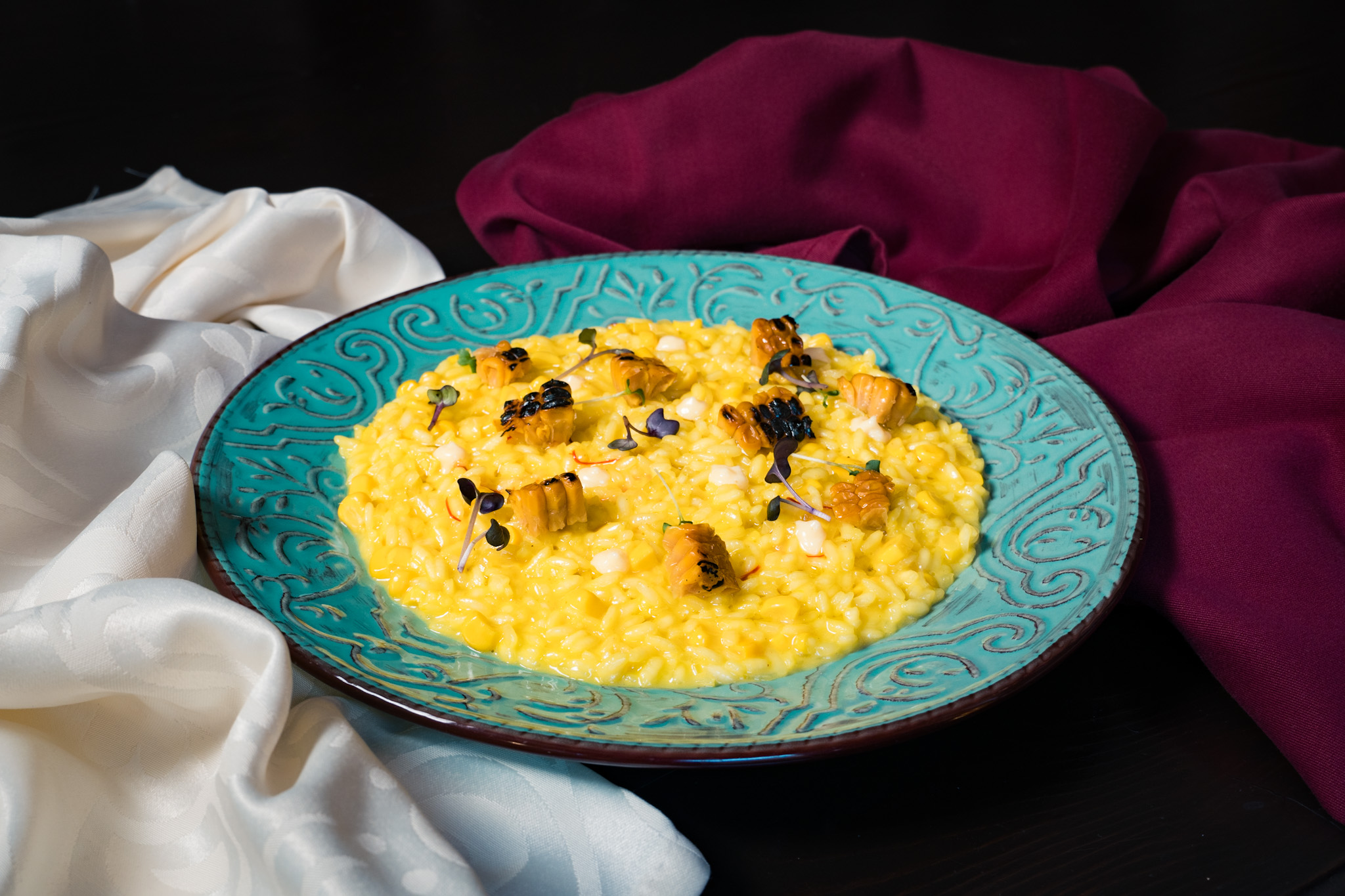 Ingrediente: Orez arborio, ceapă galbenă, usturoi, roșii, șofran, creveți black tiger, creveți decorticați, calamar tub, ulei de măsline, unt, sare, piper, busuioc, pătrunjel, lămâie, lime