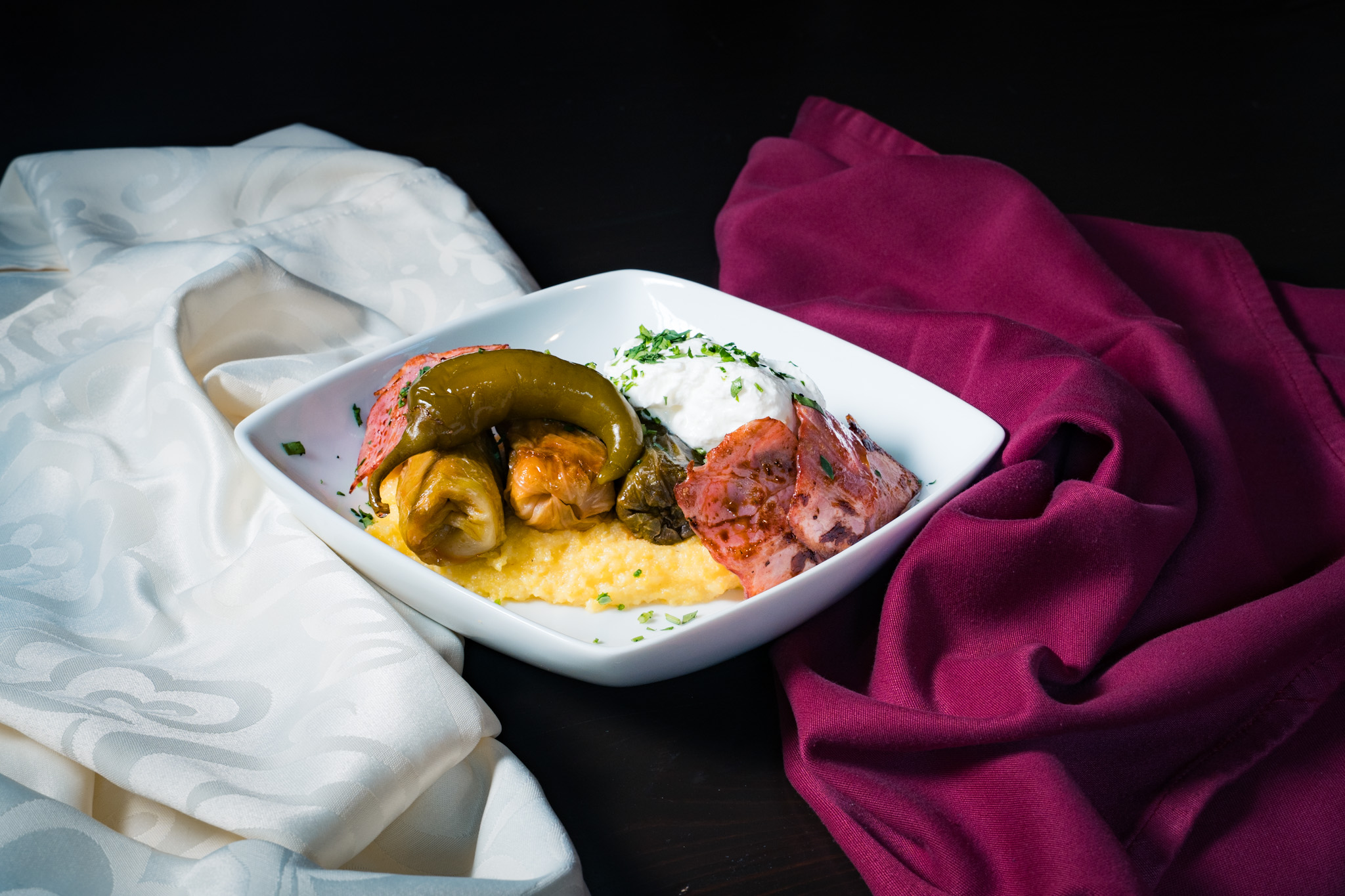 Ingrediente: Icre de carp, lămâie, piper alb, vinete congelate, muștar, zacuscă, brânză telemea, cremă de brănză, smântână, peperoncino, boia dulce, usturoi, jumări, ceapă, ou, făină albă, drojdie, ulei de florare, ulei de măsline, oregano, roșii cherry, microplante